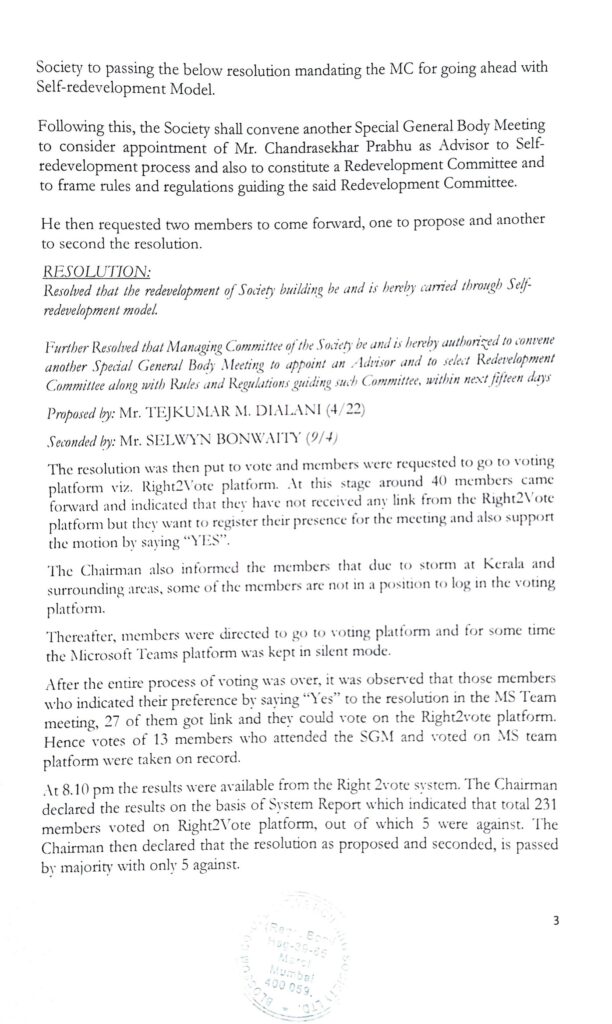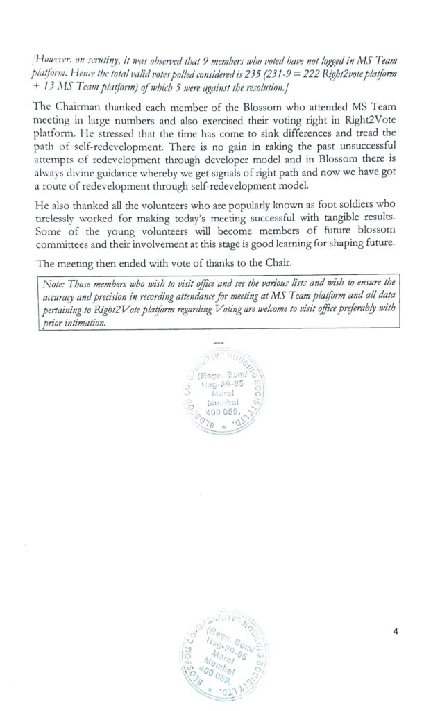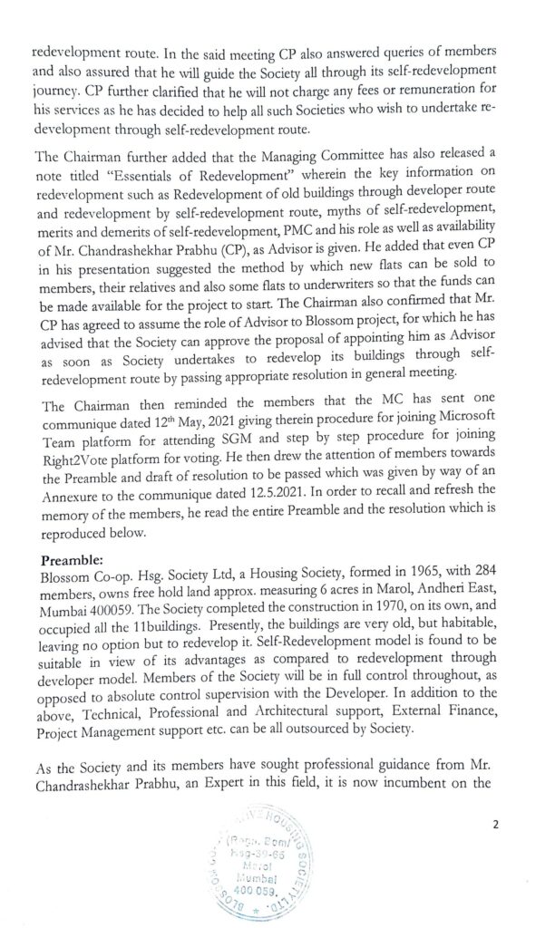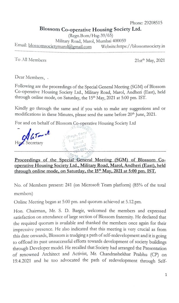 Following are the proceedings of the Special General Meeting (SGM) of Blossom Co-operative Housing Society Ltd., Military Road, Marol, Andheri (East), held through online mode, on Saturday, the 15″ May, 2021 at 5:00 pm. IST.